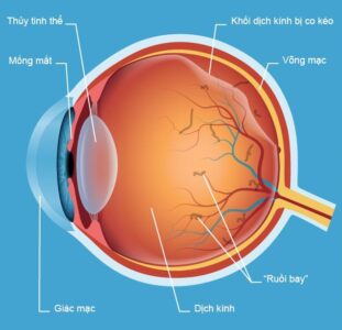 Tại vị trí võng mạc bị chết do thiếu máu đồng thời tiêu võng mạc và dịch kính tại chỗ, các mạch máu nhỏ ở chu biên tạo ra những chấm đen hoặc dải kính thoái hóa trôi vào buồng dịch kính. Người bệnh thấy hiện tượng những chấm đen như đàn ruồi, muỗi hoặc vệt dài như sợi tóc, rễ tre trước mắt. Đặc biệt, khi ra trời nắng sẽ càng thấy rõ hơn hiện tượng này, mắt di chuyển tới đâu thì chấm cũng đen di chuyển theo tới đó.